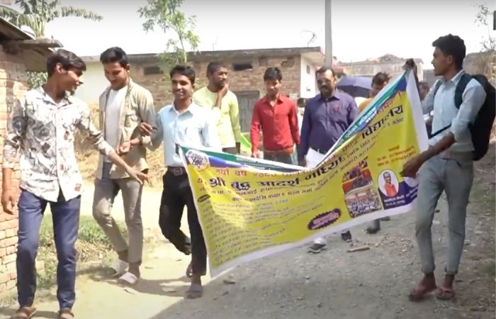 青年們拿著海報與布條,大大的展開橫幅,走遍大街小巷為尼泊爾公立學校宣傳招生。現在藍毗尼文化市教育局訂下新的規定,在各所公立學校的新學期開始前,校長、老師要親自下鄉招收新生,也找回輟學的孩子。