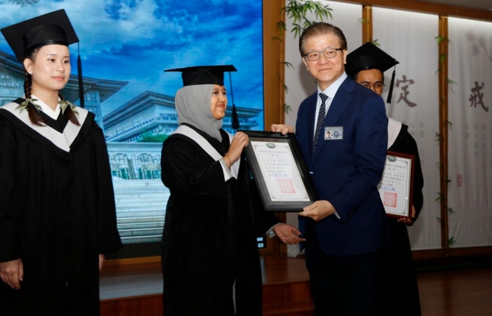 榮獲「最佳成績第一名」的畢業生是來自日惹省(Yogyakarta)斯勒曼縣(Sleman)的何強豪(Bagas Pramana Putra Fadhila),「我要感謝和感恩能獲得這樣的學習機會,讓我能翻轉人生,如今變得有一些能力幫助他人。」