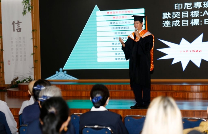 黃榮年在致詞中歡喜表示,「首先我要祝福所有畢業生,別忘了你們有今天的成就,皆是師長、慈濟志工、慈濟印尼分會及金光農業與食品公司的用心栽培。期待大家把握機會繼續發展良能,回饋及造福社會。證嚴上人時常叮嚀大家要心懷感恩,因為感恩心促進繼續虛心學習,以幫助別人。」