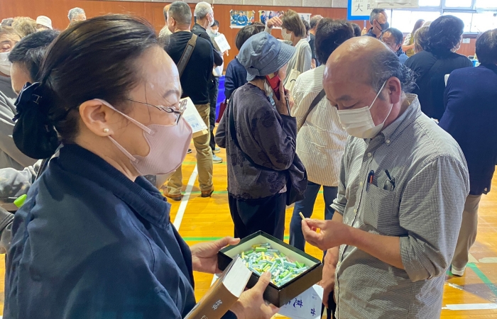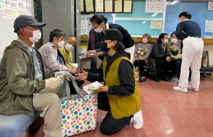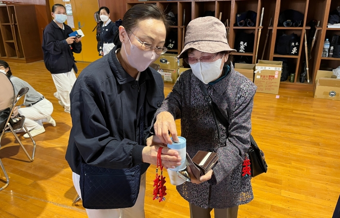 慈濟能登半島見舞金發放自17日起一連三天四場發放,第四場也是最大場預定人數一千人。發放預定時間九點開始,八點多當志工還忙於場地布置,鄉親就已經陸續抵達,因此,發放也提前了30分鐘開始。志工把握機會擺設茶席,五至六人一組,一圈圈與鄉親分享慈濟的竹筒歲月,領見舞金的隊伍中,也有志工帶著靜思語與鄉親互動。