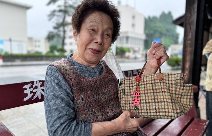 慈濟志工送上平安吊飾與浅田律子老太太結緣。(攝影:吳惠珍,地點:日本,日期:2024/07/15)