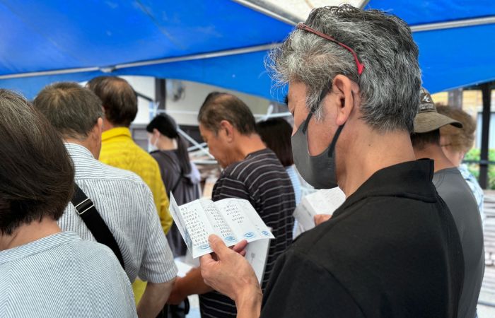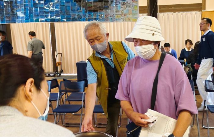 浅田律子老太太經過發放現場,得知慈濟志工在發放見舞金後,馬上詢問我也能出一點錢嗎?(攝影:吳惠珍,地點:日本,日期:2024/07/15)