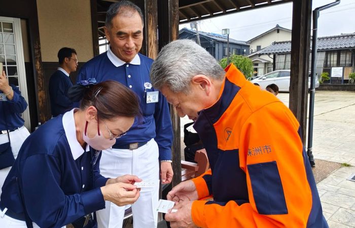 珠洲市長泉谷滿壽裕(右)特地來感謝慈濟,並看看發放是否順利。(攝影:蔡鳳寶,地點:日本,日期:2024/07/15)