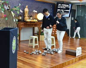 為體現靜思語中「能付出的人是有福的人」,充滿活力的慈青們特地為大眾帶來一齣自編、自導的戲劇「愛心點燈」。通過表演,講述一對盲人老夫妻,為同村鄉親們的安全著想,每晚堅持點亮一盞燈,照亮自家門前路的善行;而當冬天大雪封路時,村民們,為了這對盲人老夫妻出行安全,也自發的用木炭把他們門前的路鋪平;這正是「愛出者愛返,福往者福來」的真實寫照,也是慈青們想通過小小的短劇傳遞的理念。