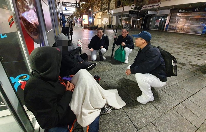 慈濟志工們活動結束後仍去街上找需要毛毯的街友。(攝影者:陳邦貿,地點:Moore Street, City of Perth,時間:2020/06/30)