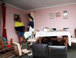 右圖:今日協助慈濟運送毛毯的朱先生,也是這次水災的受災戶(住在災區Rocklea),但他顧不得家園尚未清掃,便奮不顧身幫忙我們。圖為:淹水後家中凌亂不堪,慈濟人前往關懷。(慈濟基金會宗教處提供)