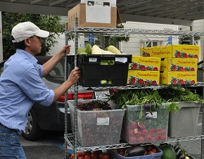 慈濟志工將農夫收市後未賣完,捐贈的蔬果運回服務中心。(攝影者:廖瓊玉,地點:Cupertino, CA,日期:2010/10/22)來幫忙的志工,有的是從家裡走路過來幫忙的,他們表示,這樣是健身、環保,又助人。也有志工原來是到農夫市場買菜的媽媽,看到慈濟志工的付出,覺得很有意義,也跟著一起幫忙,後來成為慈濟志工。