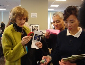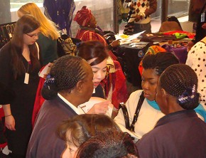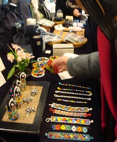 通過各地的手工藝品及文物推廣,讓前來聯合國與會的代表們有個輕鬆不同的研討會。(攝影者:紐約志工,地點:聯合國Church Center,日期:2011/02/24)別人來慈濟攤位取經,慈濟志工也到別人的攤位取經,葛蕾蒂絲和鐸拉蕾師姊看到其他非洲代表的手工藝作品,靈感不斷湧現,她們回家後,要進行產品改良,巧手巧藝也要有國際水準!