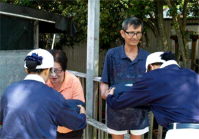 勘災發放時,志工巧遇來自台灣旅居美國四十多年、同樣前來協助災區復原的陳先生,他在異鄉看見慈濟藍天白雲的身影,主動表達對慈濟志工無私助人的肯定。