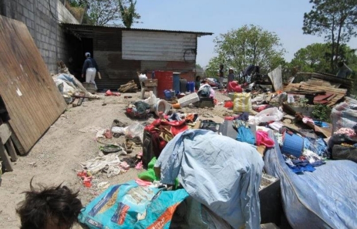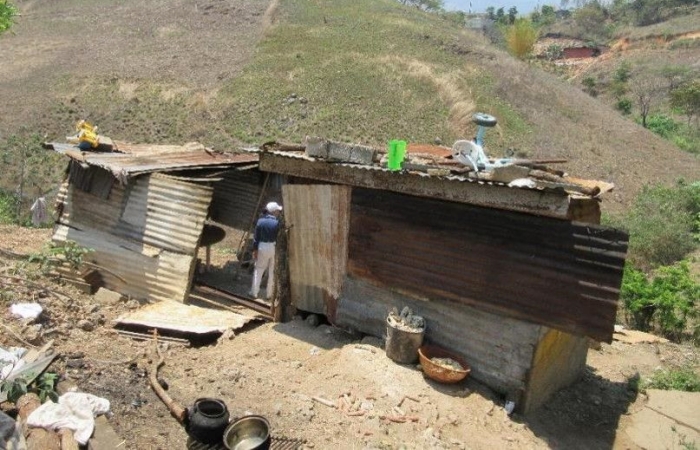 志工再走訪到一處光禿禿的山頂,只用幾片鐵皮搭蓋的一處土地上,就是卡門(Carmen Paz Medrano)和女兒雪莉(Sherly Jeaneth de Paz)及三歲外孫女,祖孫三代居住的家。屋裡破舊不堪,屋外用兩塊空心磚架上鐵條,充當露天廚房,一家三口在此窩居,也令人不捨。