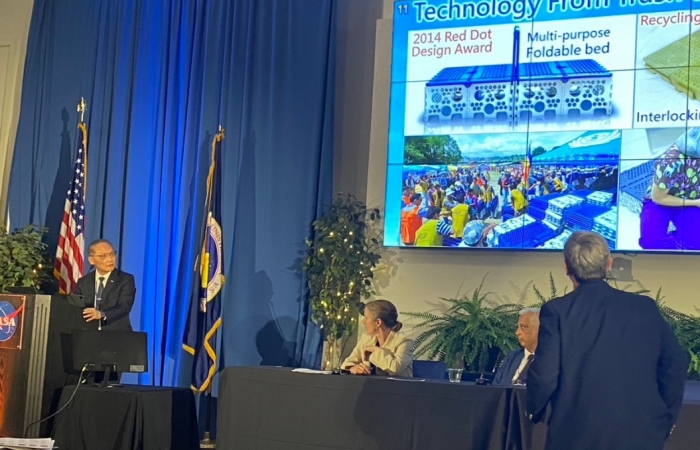 慈濟基金會執行長顏博文在NASA演說中,特別列舉賑災用的隔屏與福慧床,做為慈濟在環保人文善循環行動的其中一項例證。(圖:慈濟基金會)
