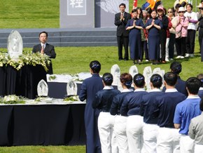 晴空下,加拿大列治文明納公園舉辦浴佛活動,全體人員雙手合十,虔誠頌念佛號。(攝影者:蔡嘉駿)同時,志工也轉述了列治文市長宣佈的好消息。慈濟志工 黎拔佳說:「市長宣布,列治文市正式定名,今天這一天,2010年5月9日為『慈濟日』。」