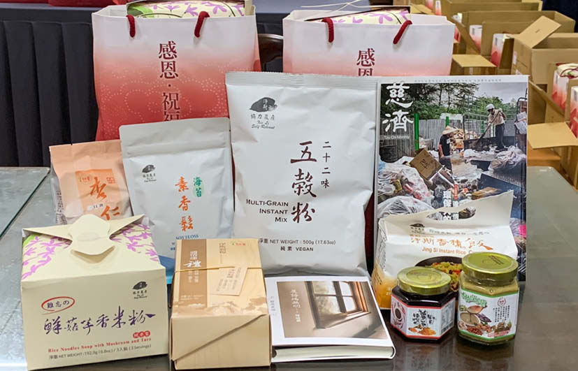 現場幫忙包裝與贈送安心祝福包的志工,一一點清每個祝福包中的品項有無錯誤。袋中不僅有提升健康的五穀粉、香椿堅果醬、椒香薑黃醬、杏仁一口餅等美味營養的食品,還有加強心靈保護力的靜思晨語、慈濟月刊;讓員警在身體增強防疫以外,也能得到心靈的正能量,在疫情加溫的時刻也有力量面對艱難的任務,挺身前進。