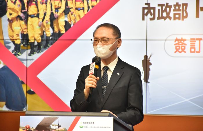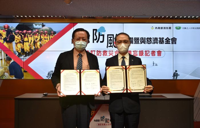 由消防署蕭煥章署長、慈濟基金會顏博文執行長分別代表正式簽訂「防救災合作備忘錄」。(攝影:消防署提供,地點:臺灣,時間:2022/06/15)6月15日,消防署邀請財團法人賑災基金會、慈濟基金會共同合作,期望能強化民間自主防救災能力,並且藉由民間力量,協力投入防災士的培訓,提高社區韌性。為進一步深化雙方合作關係,消防署蕭煥章署長、慈濟基金會顏博文執行長分別代表正式簽訂「防救災合作備忘錄」,透過教育宣導加強民眾平時的防災觀念。