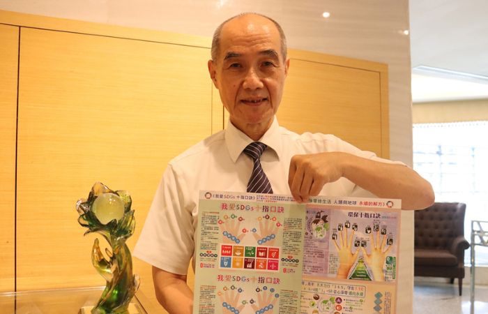 陳哲霖本為退休工程師的身分,將個人興趣結合宗教理念,投入環境教育創意教學,分享自製的教材。(攝影:顏福江,地點:臺北,時間:2022/06/28)(文:顏福江 臺北報導 2022/06/28)