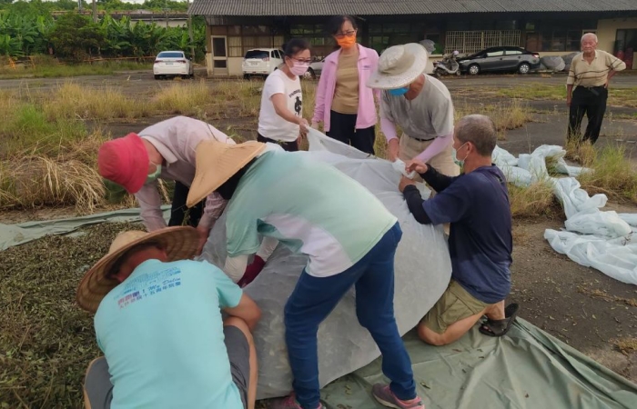 大夥搶晴天迅速採收,採收回來處理過的抺草還得曝曬。(攝影者:陳世嫻,地點:嘉義大林,日期:2022/06/25)