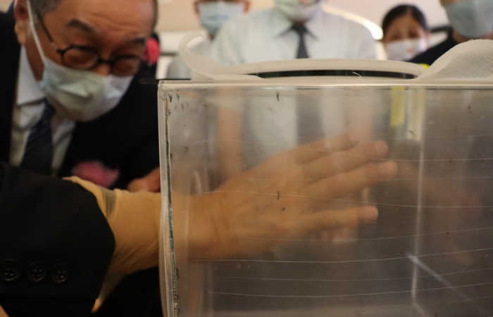「雄蚊體驗箱」裡面有超過一百多隻雄蚊,讓民眾體驗了解「雄蚊不吸血,雌蚊才吸血」的知識。(攝影:顏福江,地點:新北市,時間:2022/07/07)若民眾想更加了解這種夏日揮之不去的惱人「小朋友」,還可以從AR畫面中觀察蚊子的各個蟲期真面目;除此之外,在「沃爾巴克氏菌——登革熱生物防治法」介紹區,有考驗膽量又吸睛的「雄蚊體驗箱」,超過100隻雄蚊飛舞,可以經過特製護套將手伸進箱內,實際體驗「雄蚊不吸血,雌蚊才吸血」的昆蟲小常識。