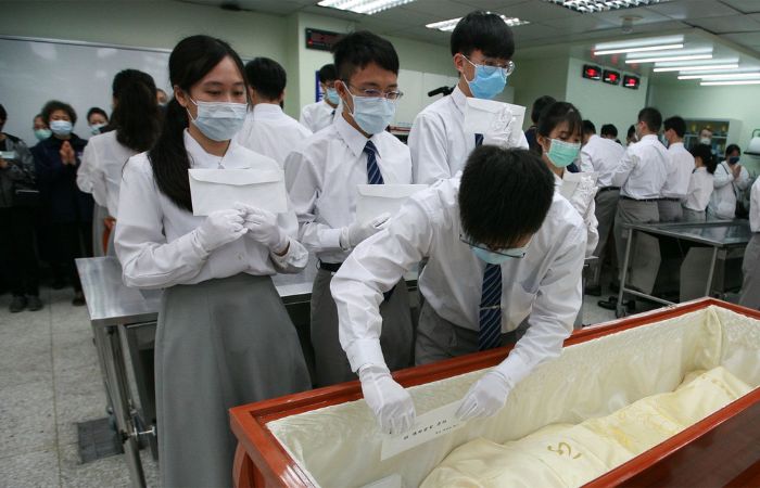 慈大的醫學生會陪伴家屬與無語良師走完全部的儀式;在課程結束後帶著尊重與感恩,每位學生為大體老師包裹入殮,並且放入自己的親寫信,感謝老師的付出為醫學界培育新苗,並且一同走過最後的植葬,為老師送靈、追思。