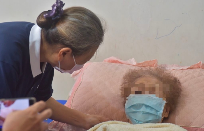 志工鐘淑如握著老太太的手,愛與關懷並祝福她早日康復。(攝影者:梁永志,地點:高雄仁武區,日期:2022/08/27)「有這張電動床真的很感謝,解決了我們的困難。」林先生歡喜地說:「原本睡在沙發床的媽媽可以讓她輕鬆的坐起來,還有腳也可以抬高了。」原來林老太太的心臟不好,醫生建議躺著時腳要抬起比心臟高,「有了它我們可以不用墊許多枕頭和被子。」林先生指著一旁一堆的枕頭棉被說道,它們不是用來支撐林老太太的背部,就是墊高腳,「我太太還用紙箱裹著被子墊在背後支撐著媽媽,有步想到沒步了(臺語)。」