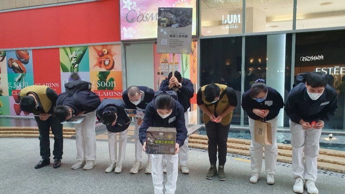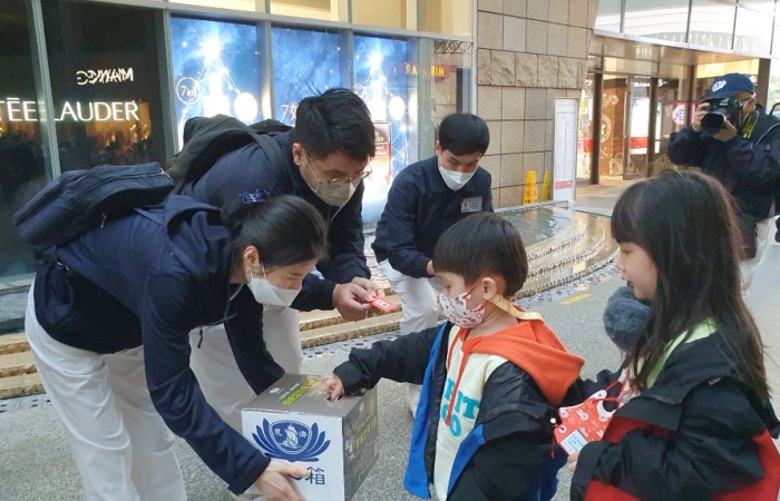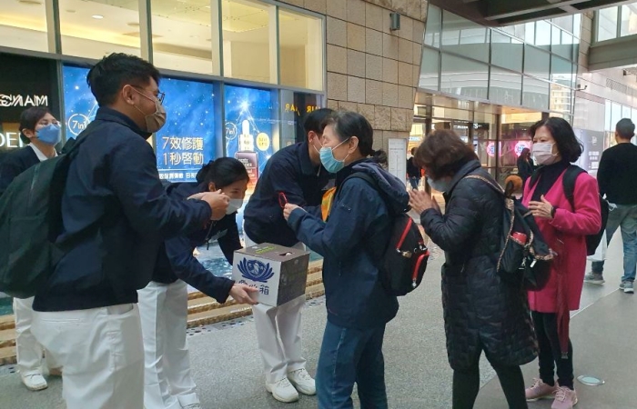 年輕人以活潑又不失莊重的儀表,在街頭灑播善種子,很是吸睛,路過民眾不論大人小孩或年長者,紛紛解囊獻愛心。(攝影者:丁碧輝,地點:臺北大直美麗華,日期:2023/02/27)大愛共伴 青年北上相挺