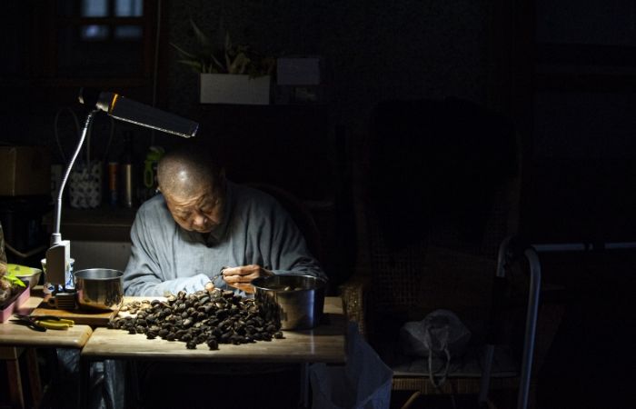 德仰師父細細剝出精舍自種的印加果果實,給常住眾補充營養,日常工作開小燈便足以進行,是常住的惜福日常。(攝影:黃筱哲,地點:花蓮,時間:2020/04/30)德仰師父,1970年皈依圓頂,成為證嚴上人的第五位出家弟子。生性沉默寡言,但一提到漢文讀經,他欣然教導念誦。仰師父1939年生於花蓮,俗名謝寶祝,家有十位兄弟姊妹,年少即嚮往出家。為協助家中生計而學習裁縫,憑著精細的手藝受僱於慈善院做女紅,同時也是該寺的信眾,因此埋下了日後與上人結為師徒的因緣。