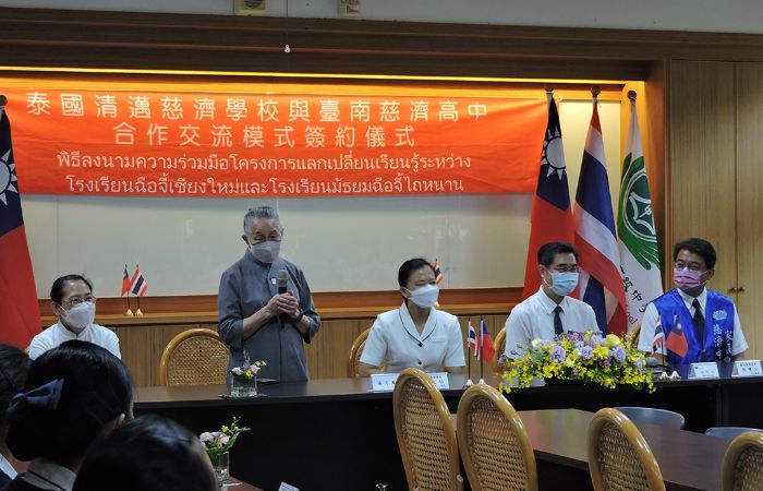 臺南慈濟高級中學於4月24日與泰國清邁慈濟學校進行兩校合作交流備忘錄簽訂儀式。(攝影:林育吟、蕭相渤,地點:臺南,時間:2023/04/24)細數兩校歷史交流足跡,泰國清邁慈濟學校首次於2009年蒞臨臺南慈中進行為期四天的參訪交流,臺南慈中則於2015年4月2日前往泰國清邁慈濟學校簽訂合作備忘錄。在此之後,臺南慈中師生在暑假辦理泰北海外國際志工暨人文交流,透過跨國際的校際交流以及跨國教師聯誼,共同深耕教育及美善人文精神。