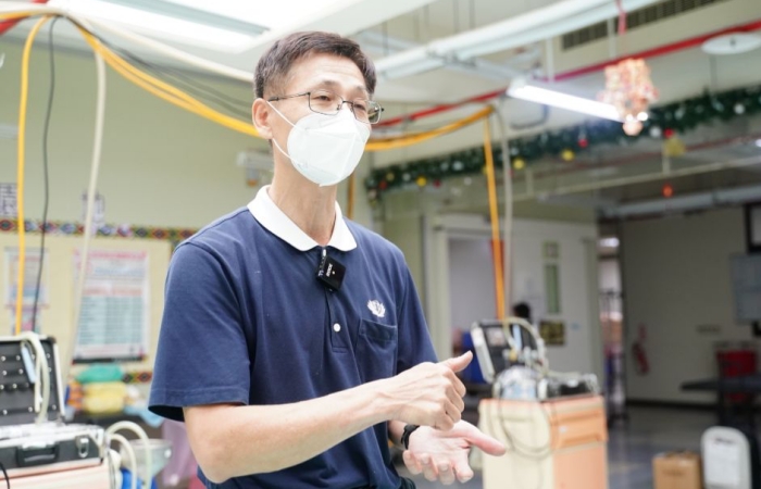 如願復刻大型吸唾機,讓陳俊裕有著很大的成就感。期許自己做醫師與管線志工安心靠的強力後盾,是他參與義診六年多來的唯一心願。(攝影者:陳亞屏,地點:創世基金會臺東分院,日期:2023/05/20)