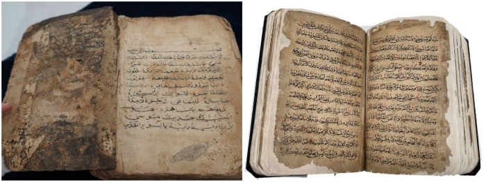 這本《古蘭經》有火燒、泥土的痕跡,國立臺灣圖書館徐美文博士推測它歷經過戰爭與地震,書頁裡有疑似血跡、泥土、花瓣、男性毛髮、植物種子,最多的是還在侵蝕書本的菸甲蟲。徐美文博士接下這個任務時其實心裡很忐忑,後來評估書本的紙張是用「從唐朝傳到大食的造紙技術所抄製的『麻紙』」,就比較有信心了。