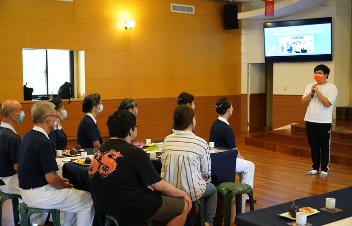 林均嶧因學習成績優異,連續十年獲得「慈濟新芽獎學金」,年年榮獲成績優異的「學習領域獎」,向大家分享心路歷程。(攝影:詹大為,地點:彰化,時間:2023/07/05)(文:詹大為 彰化報導 慈濟基金會文史處編輯 2023/07/05)