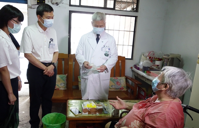陳金城副院長則前往新港鄉及大林鎮社區關懷。76歲的余阿嬤有大腸癌、乳癌問題,因獨居又加上長期不良於行,坐輪椅的她,無奈生活起居只能靠著慈濟志工及長照人員協助。陳副院長發現,余阿嬤桌上及廚櫃擺放各種不同大小藥包,多重用藥及不同止痛藥,不僅傷肝又傷腎,同時還有止瀉藥及通腸藥同時使用,讓阿嬤病況反覆不穩定。在確認目前主要的治療在大腸癌,後續將由慈濟訪視志工協助就醫做進一步治療。