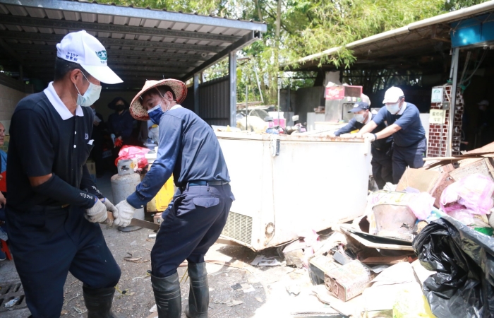 是日,包含慈濟志工、宜蘭縣政府社會處社工及替代役男、當地長照機構同仁等40人,在烈日烘烤下的鐵皮屋體感溫度比當天氣溫36度還高,大夥用人龍方式一手接一手將雜物送出屋外,沒有人放慢速度。