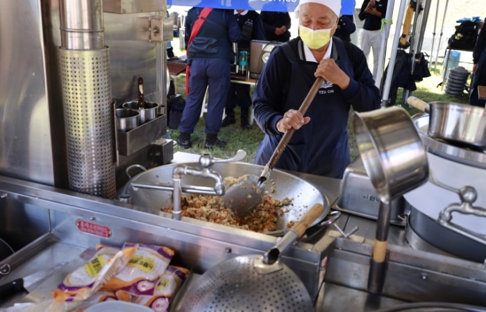 慈濟志工利用行動廚房烹煮,這套裝置能夠為災區提供熱食。(攝影:羅明道)