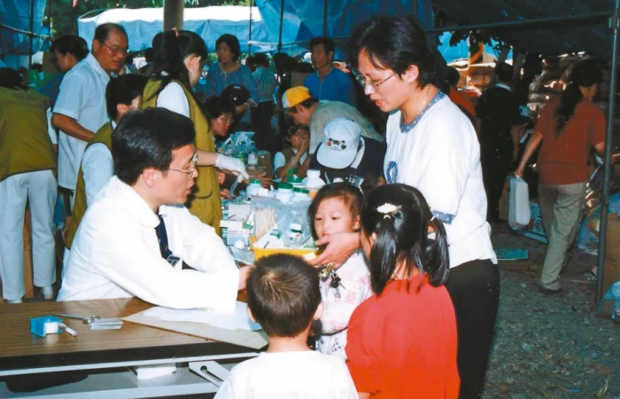 一九九九年臺灣發生九二一大地震,簡守信(左)與花蓮慈濟醫療團隊當日即趕赴災區救助傷患。(攝影:花蓮慈濟醫院)「醫療是人文關懷的工作,不該只以數字、商業角度來衡量成果;醫療是獻身的志業,不是單純的行業。」簡守信院長逾40年來,對此信念奉行如一,他也說:「人間就是我的診間。」