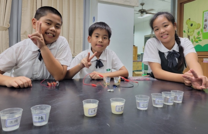 小朋友發現,桌上的豆漿、汽水、小蘇達、鹽水等各種酸鹼不一的液體,也都能發電。(圖片提供:慈大附小)四年一班簡靖同學表示,當他玩空氣砲,用力拉起橡皮筋,將塑膠杯中的空氣推出去,聽到破裂聲那一剎那,他才真正體會到壓力與空氣的關係。他說將來長大,希望成為一名科學家,想保護地球,讓地球更美麗。