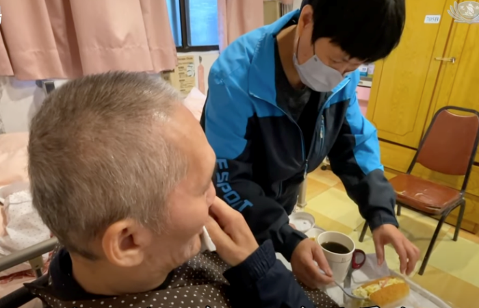 圖說:洪錦華餵中風的先生吃點心。(圖:大愛電視《行動現場》節目畫面)10年前因先生中風,必須長期復健,無法再如常地工作,家裡頓失經濟來源,而為了照顧先生和小孩,又要有固定收入,洪錦華決定代替先生經營配鎖行。