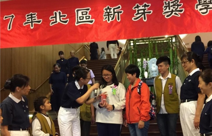 圖說:洪錦華的女兒李若綺(左四)成績優異,連續五年獲慈濟新芽獎學金。洪錦華(著橘外套者)陪同女兒參加頒獎典禮。(圖:吳佩樺)後來經過社會局通報,慈濟志工開始走進這個家庭,成為這家人的後盾;洪錦華的先生也聽從志工的建議,將一身的專業技術慢慢傳授給她。