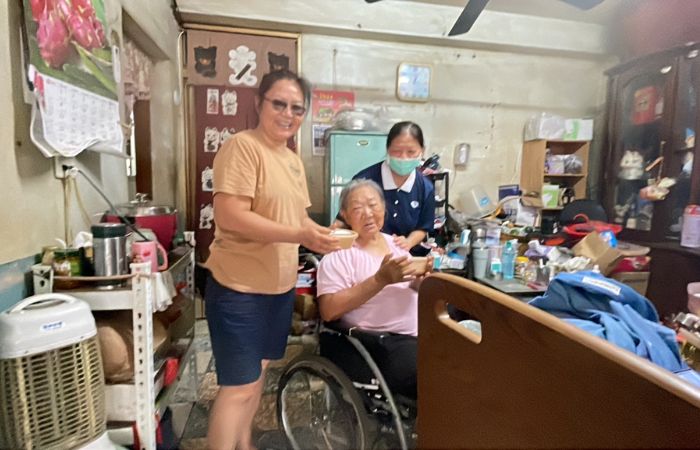 雲林虎尾鄉親廖美惠要忙於清理家園和照顧母親,當她收到慈濟志工送來的熱便當,非常歡喜。(攝影:張麗敏 地點:虎尾)慈濟熱便當暖胃暖心