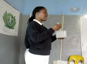 一日精進活動中也示範怎麼拿筷子,讓人人用餐時不再是用手抓飯。(畫面擷取自大愛新聞)在賴索托舉辦志工精進日活動,僅開放二十個名額,卻來了六十多人,當地志工歡喜承接,一切也都從頭學起。慈濟志工陳美娟說:「透過打手印,可以讓心思更專一,眼睛看見的會更清明。」