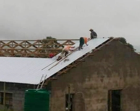 歷經四十五天興蓋完成的社區中心,施工期間常處於下雨天,讓營建團隊經常得在雨中的泥濘工地進行趕工,德本志工林益安為了不延誤工程,總是自己爬到最高頂施工。(照片由人文真善美志工提供)就地取材靠自己 南非志工齊興建會所