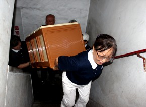 來到義五路的新租屋處,志工依序將物品搬上四樓並協助歸位。(攝影者:陳惠玲,地點:基隆市義五路,日期:2015/05/23)人龍接力 協助搬家