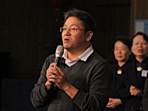 苗栗縣造橋國中校長林育伸,為感恩慈濟援建老舊校舍,唱出自己創作的〈築心雋永〉。(慈濟基金會秘書處提供)