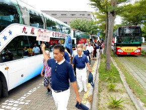 響應節約能源的號召,參加七月祈福會的社區民眾,共乘遊覽車前來高雄靜思堂參與盛會。(攝影者:王煒傑,地點:高雄靜思堂,日期:2015/08/22)一直都在 走過世間風風雨雨