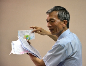 「要給子孫圓滿代代強的人,請舉手?希望家庭幸福美滿的人,請舉手?」因為做慈濟才開始學說臺語的鄭莉莎,定居北京近二十年,是北京最早期的慈濟志工之一,因為小兒子工作關係剛回到臺灣三個多星期,鄭莉莎帶著大家讀一遍「蔬醒卡」的祝福語。