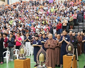盛大的浴佛典禮開始,慈濟志工虔誠恭敬地手捧燈燭,兩兩成行從階梯上緩緩進入會場,人人步伐整齊,跟隨著佛號聲一步一步前進,十分隆重。「禮佛足,接花香,祝福吉祥!」人們聽到司儀的聲音,一個個逐步往前,來到水霧氤氳繚繞的浴佛臺前,禮佛足、沐佛恩。