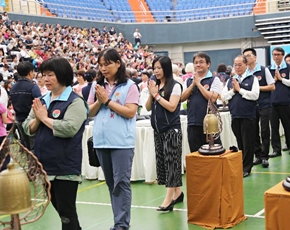 「帶學生來參加這樣的活動,深具意義,可以培養學生的好品德,讓孩子懂得知足包容,淨化自己的心。」慈濟援建的減災希望工程學校之一,苗栗縣公館國中總務主任崔春平帶領十一位學生,一同參與5月14日慈濟志工在苗栗巨蛋所舉辦的浴佛大典,她深受感動地表達心中的感言。