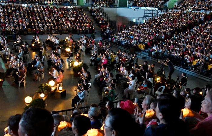 香雲裊繞、花香芬芳、天籟妙音悅耳,大眾觀想靈山法會的莊嚴肅穆,在眾法師帶領下,齊聲唱誦〈爐香讚〉。來自北區的鄰里長及各級學校的校長、主管,以虔誠清淨之身心,在莊嚴的佛號聲相伴下,為佛陀獻供燈、湯、花,祈求光照大千,普度世間一切苦難眾生。