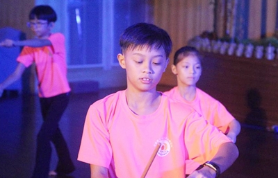 今年就讀六年級,身形較其他同學壯碩的李以安,在這群穿著鮮橘色運動衣的團隊裡,同樣展現敏捷的肢體語言。對於此次響應茹素,他分享:「校長說她來慈濟(參加演繹)後,開始吃素。我看到其他同學可以吃素,我覺得我也可以做到。」