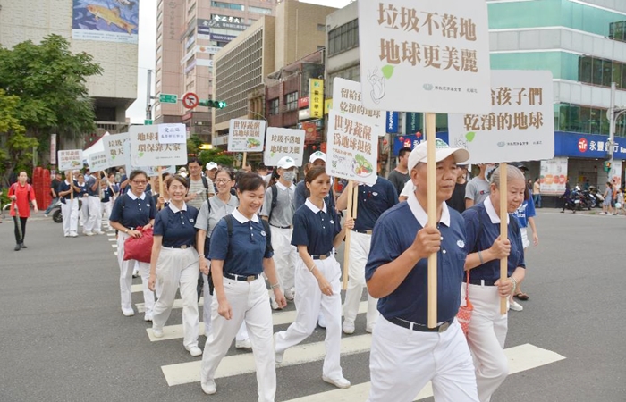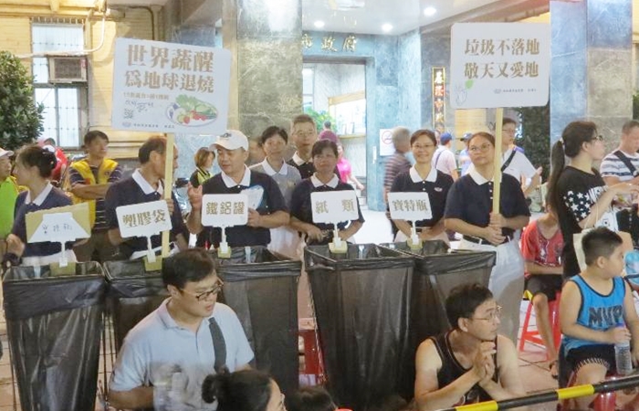 此刻一群穿著藍天白雲的慈濟志工,隱身在慶典中,忙碌穿梭。在遊客如織的遊行人潮密集處,設置十二個環保宣導定點,舉著「垃圾不落地 敬天又愛地」、「世界蔬醒 為地球退燒」的舉牌,引導前來丟垃圾的民眾做資源分類,有別於以往的宣導,今年更增加了塑膠袋回收,讓「減塑」環保行動落實得更加徹底。