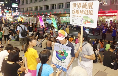 另一站自備音響的志工黃明麗,和搭檔郭惠雪一搭一唱,以〈呷菜上介讚〉邊唱邊跳,向來往民眾,宣導「世界蔬醒為地球退燒」茹素健康的慨念。民眾楊芝珉和父親一起來觀賞「雞籠中元祭放水燈遊行」,路過志工的宣導點,也與志工分享:「自己平常就響應吃蔬食,不吃肉對身體更健康。」