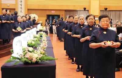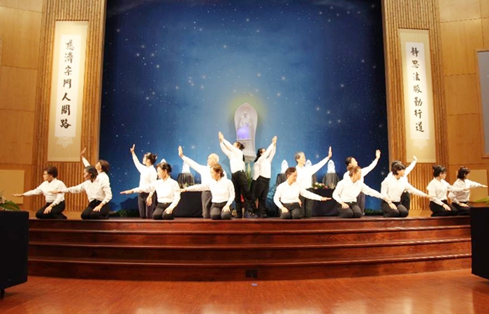 兩位八十歲的志工鄭惠美、林美菊,投入慈濟義無反顧,兩人表示就算吃止痛藥、貼藥膏都要過來莊嚴道場。看著這群資深志工們一步一腳印朝著舞臺中的宇宙大覺者前進,穩重而踏實的腳步代表對慈濟的護持,還有永不懈怠的傳承。